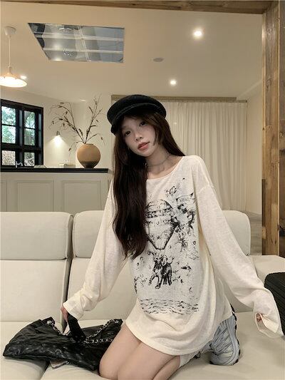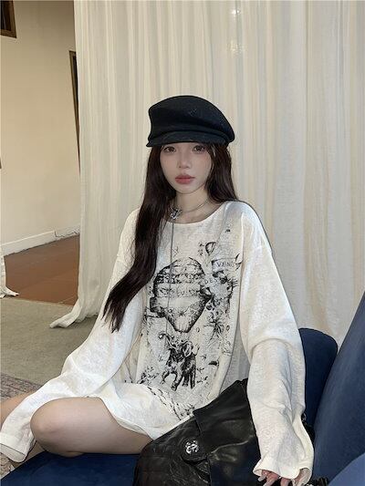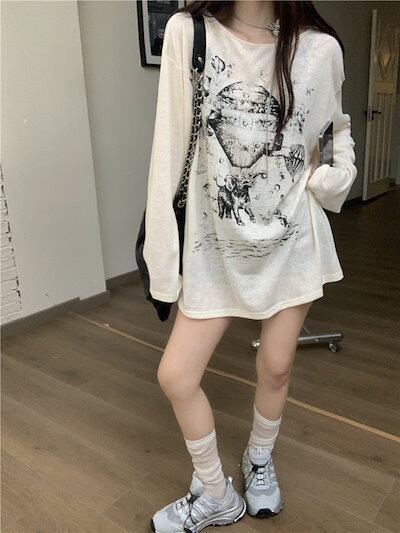 2024 秋冬tシャツ 長袖 ドロップショルダー クルーネック トップス ルーズ レトロ衣装シルエット 韓国系 ファッションサイズ レディース 大人可愛い