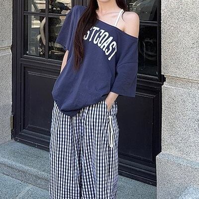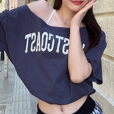 2024秋冬トップス Tシャツ 半袖 英語 肌見せ ゆったり 細見え 秋冬 ネイビー おしゃれ かわいい 韓国系ファッション レディース お出かけ