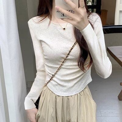 秋冬2023 ロンT コットン 長袖プルオーバーブラウス 女性 アーク裾 不規則 Tシャツ インナーギャザートップス スウェット 長袖 tシャツ 韓国 ニット