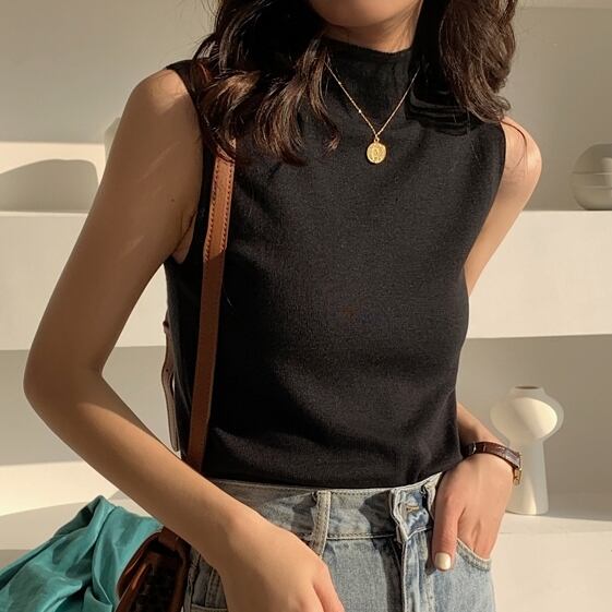 2021年新作 韓国系 ハーフネックノースリーブトップス無地ファッションレディースTシャツ