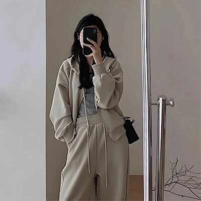 春上下セット韓国ファッション レディースセットアップ韓国ファッション 運動セット涼しく楽ちんセット秋冬ジャージ二点セット運動セットおしゃれ百掛け長袖無地デザイン感ニッチカジュアルスウェットズボン