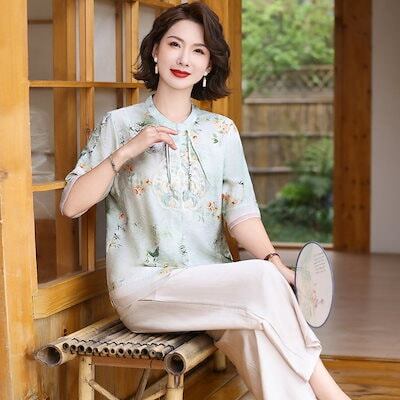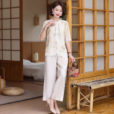 涼しく楽ちんセットアップ レディース 夏 お母さんの夏服綿麻スーツ2024新中式老年女性の夏の半袖国風シャツ2枚セット ルームウェア セットアップ スウェット上下セット スーツ