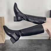 ニーハイブーツ レディース ロング丈 スクエアトゥ ローヒール 合皮 レザー調 春秋冬 美脚 大人