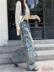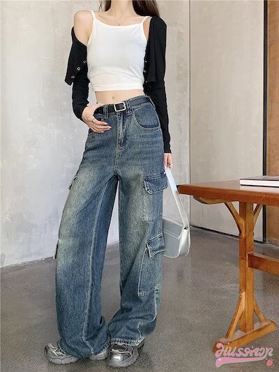2024 春夏パンツ モップパンツ デニム ジーンズ ワイド ストレート ポケット ハイウエスト 脚長効果 美脚効果 細見え ウォッシュ加工 春 水色 カジュアル 韓国ファッション レディース お出か