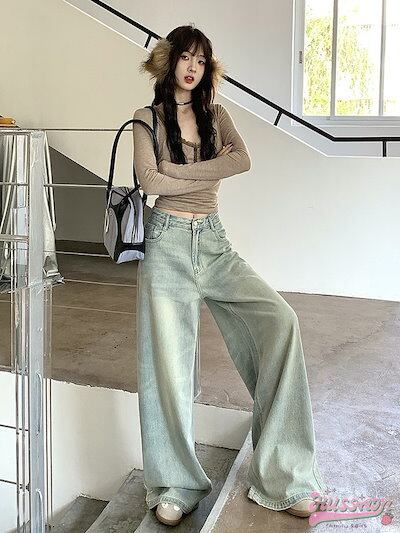 パンツ デニム ジーンズ ワイド ストレート ハイウエスト 脚長効果 美脚効果 細見え 春 カジュアル 韓国ファッション レディース お出かけ