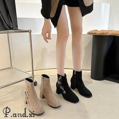 シンプル ブーツ シューズ スエード スムース 太ヒール レディース サイドジッパー ショートブーツ サイドファスナーブーツ 刺繍ブーツ 秋冬 センチヒール