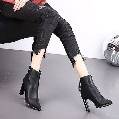 韓国ファッション 秋冬 新作ポインテッドトゥ ハイヒール ショートブーツ レディースファッション 太ヒール 通勤靴 ヒールブーツ シューズ