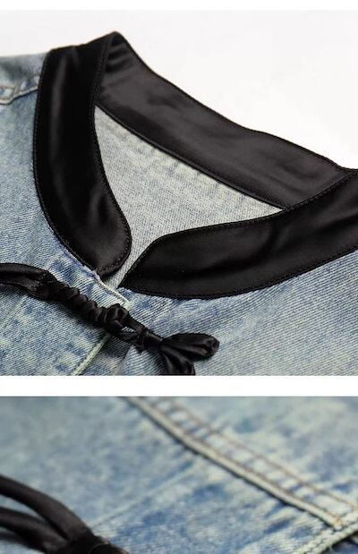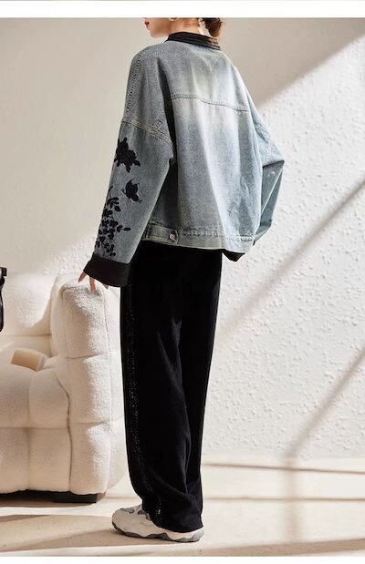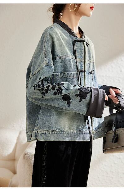 デニムジャケット ノーカラー ジャンパー レディース Gジャン デニム コート チャイナ風 ジージャン チャイナボタン 刺繍 長袖 羽織り ライトアウター 花柄 ゆったり カジュアル アウタ
