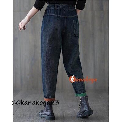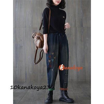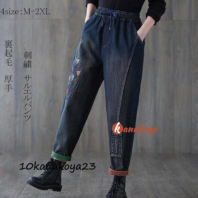 サルエルパンツ デニム 刺繍 裏起毛 テーパードパンツ ボトムス ズボン レディース カジュアル ポケット付き ゆったり ウエストゴム 無地
