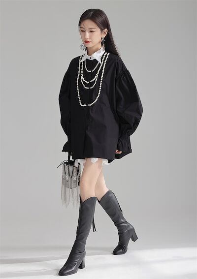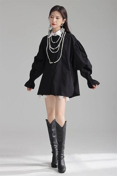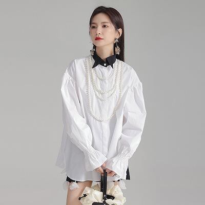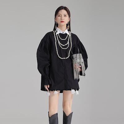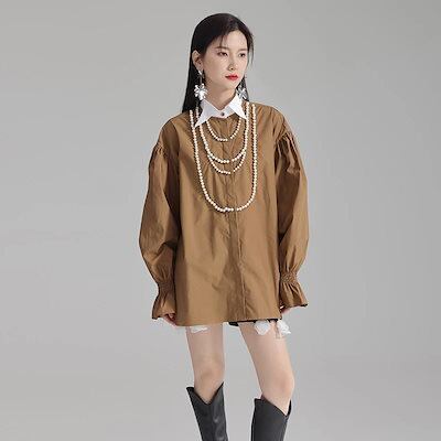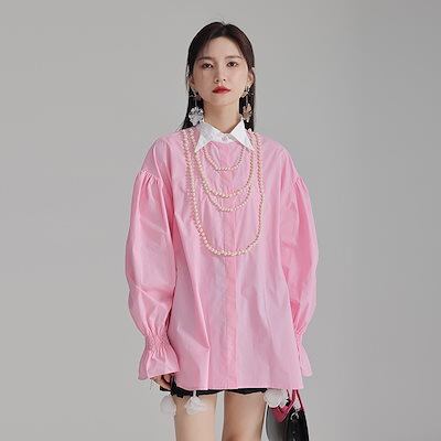 【J.Fashion】 2024春新品 パール飾り レイヤード 2層襟 ロングブラウス 体型カバー チュニック レディース シャツ 関連商品は店で購入可能