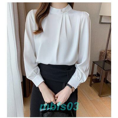 ブラウス レディース 長袖 シャツ スタンドカラー 立ち襟 通勤 ビジネス フォーマル タック パール付き ファッション