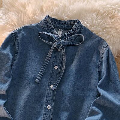 夏の準備!ブラウス レディース トップス シャツ デニム 立ち襟 フリル リボン ボウタイ 長袖 春 春服