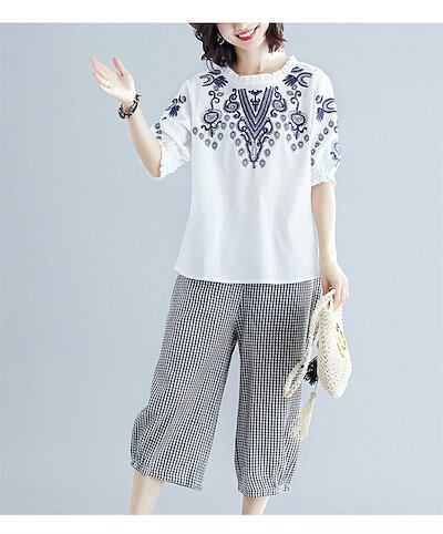 ブラウス 花柄刺? ブラウス 夏 Tシャツ レディース 半袖 綿麻風ブラウス トップス フリル襟 プルオーバー 花柄刺? 森ガール カットソー エスニック 大きいサイズ ゆったり 爽やか ナチュラル