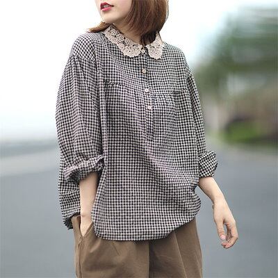 チュニック ブラウス レディース 長袖 チェック柄 レース襟 大きいサイズ Tシャツ プルオーバー トップス ゆったり カジュアル キレイめ ナチュラル 大人可愛い 着?せ 森ガール レッド ブラッ