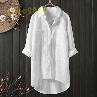 ロングシャツ ブラウス シャツ トップス シャツブラウス レディース チュニック ロング 折り襟 綿麻 長袖 無地 ポケット 体型カバー ゆったり シンプル 30代