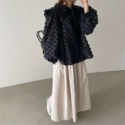 ブラウス レディース トップス シャツ ビックカラー セーラーカラー フリル 襟付き 袖あり 長袖 ボリューム袖 デザインカラー 衿 折り襟 前開き 透かし感 きれいめ 二の腕カバー ゆったり ラフ