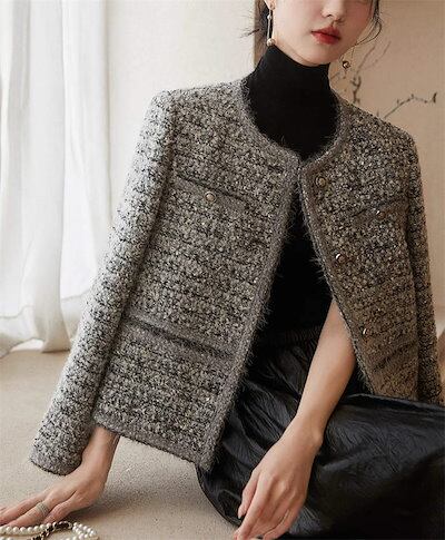 ツイード ジャケット レディース ノーカラージャケット 春 秋 冬 ノーカラー 長袖 アウター 無地 トップス 羽織り ママスーツ おしゃれ シンプル きれいめ ツイード 体型カバー カジュアル お出