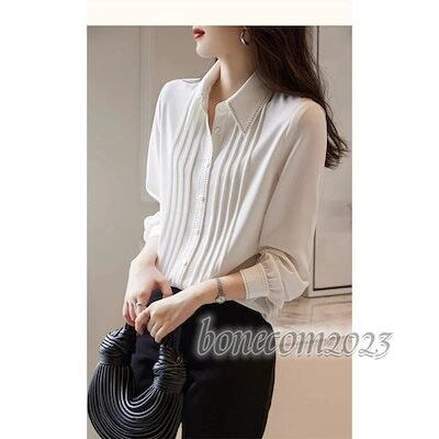 トップス シャツブラウス 白 ぽわ きれいめ オフィス 秋冬 長袖 ビジネス ギャザー フリル ジョーゼット レディース 春 ブラウス きれいめ シャツ ブラウス 秋冬