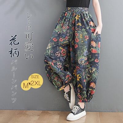デニムパンツ 花柄 バルーンパンツ 夏 レディース デニムワイドパンツ 大きいサイズ ゆったり 9分丈 花柄 ジーンズ コクーンパンツ 柔らか ボトムス ジーパン 美脚 春夏秋 森ガール ウエストゴム