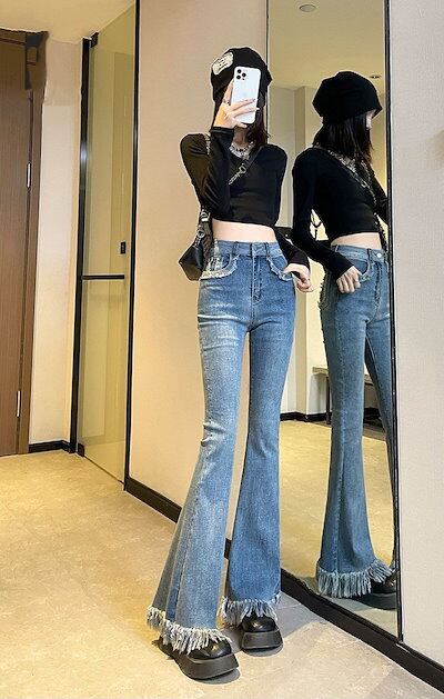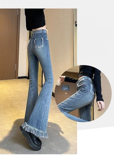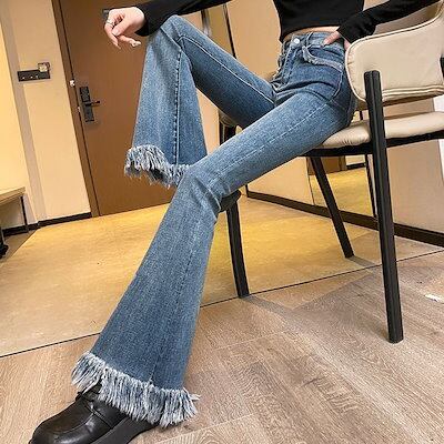 韓国ファッション 大きいサイズ レディース ハイウエストジーパン フレアパンツ デザイン ロングデニムズボン