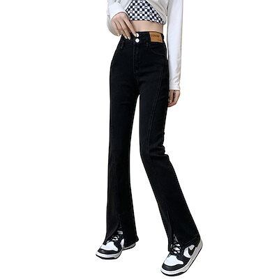 脚長効果!スキニーデニムパンツ フレアパンツ デニム レディース スリット 美脚 美尻 薄手 newjeans カジュアル