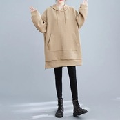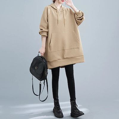 可愛い大きなポケット無地長袖トップス大きいサイズレディース秋服韓国ファッションパーカー中長着痩せ効果 母の日