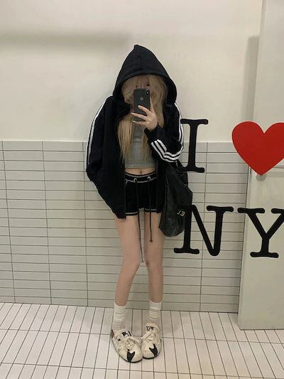 2024 秋冬トップス パーカー フード付き チャック 長袖 ストライプ ゆったり 細見え 白 黒 おしゃれ かわいい ガーリー キュート 甘め レディース お出かけフルトラック安い