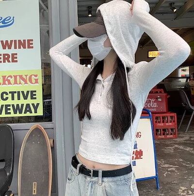 パーカー レディース トップス ショート 長袖 Vネック ポロカラー タイト かわいい きれいめ シンプル おしゃれ かっこいい ラフ メンズライク マニッシュ 無地 ネイビー オルチャン 20代