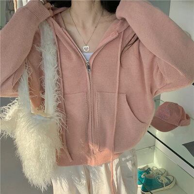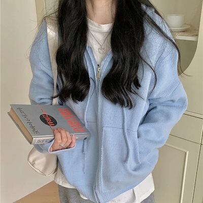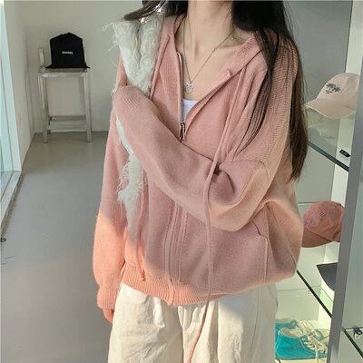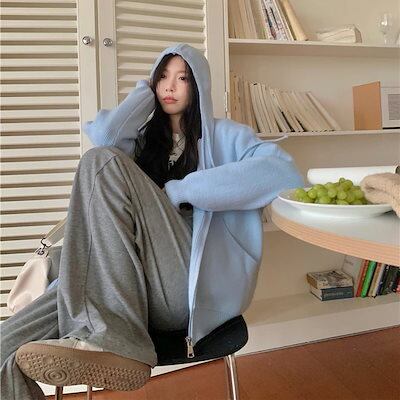 トップス レディース ニットパーカー ジップアップ オーバーシルエット フード付き ニット 長袖 パーカー ボリュームスリーブ ドロップショルダー ラグランニット ピンク ブルー イエロー グレー