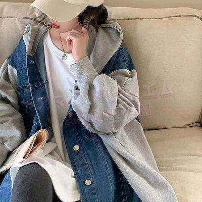 パーカー レディース 春 秋 レディースファッション 春秋トップス 大きいサイズ デニムパーカー フード付き 長袖 カジュアル フェイクインナー 重ね着風 新作 魅せる コーデ 着せ オシャレ カジュ