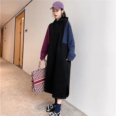 ロングパーカー パーカー フード付き 裏起毛 ワンピース マキシ レディース バイカラー 体型カバー アウター ゆったり 無地 大きいサイズ