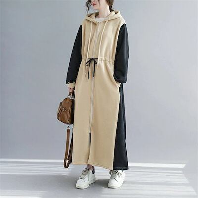 裏起毛 パーカー ワンピース 秋冬 ワンピース 長袖 大きいサイズ 冬 ワンピース 長袖 レディース 前開き 配色 カジュアル 上品 大人可愛い フード付き きれいめ ジップアップ ロング丈 ウエスト