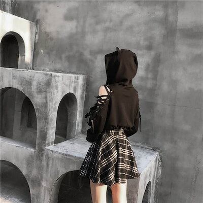 フェス猫耳 パーカー レディース 黒 肩だし 可愛い 長袖 無地 コスプレ バンギャ ライブハウス フェス イベント ハロウィン ショート丈 ボリューム袖 レースアップ 春 秋 冬 カジュアル ラブ 大人可