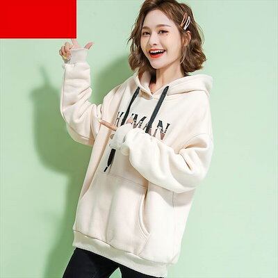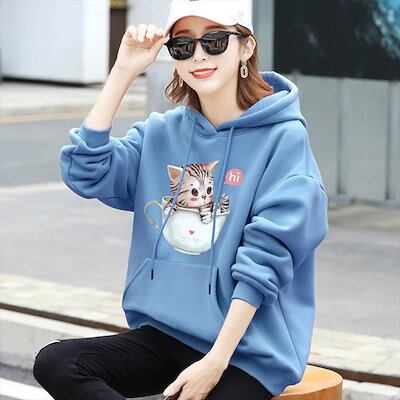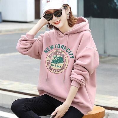 トップス ロゴ レディース パーカー フーディー ミディアム丈 袖あり 長袖 ドロップショルダー 襟なし フード付き 綿 厚手 かわいい シンプル カジュアル ラフ キュート ルーズ 柄 プリン 大人