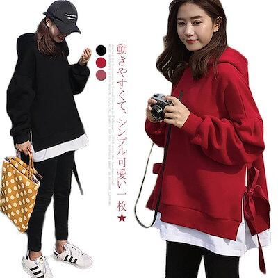 パーカー レディース プルオーバー 長袖パーカー 無地パーカー ゆるパーカー フード付きパーカー 切り替え 重ね着 レイヤード ルーズ ドロスト付き 大人用 BF風 韓国ファッション シンプル 通勤