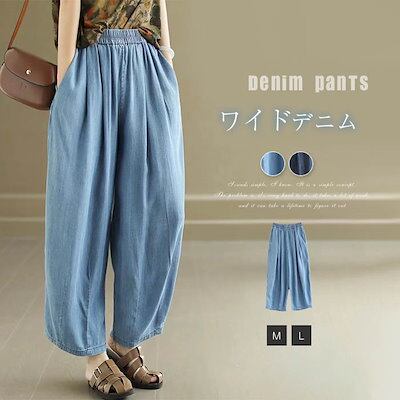 ワイドパンツ デニム レディース きれいめ 9分丈 アンクル丈 涼しい イージーパンツ ボトムス ウエストゴム 大きいサイズ 体型カバー 着痩せ 無地 美脚 通勤 ゆったり 薄手 カジュアル きれいめ