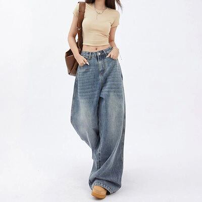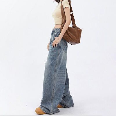 激?れ人気商品 脚長効果!デニムパンツ かっこいい!デニムパンツ レトロルーズワイドレッグジーンズレディースニューハイウエストドレープストレートジーンズパンツ