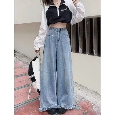 ワイド ストレートロングパンツ ハイウエスト デニム フリル レディース 秋の新作スリムフリンジ