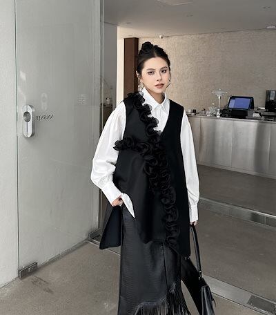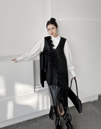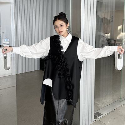 【J.Fashion】 2025春 PUレザー ベスト Vネック フリル おしゃれ レディース トップス 関連商品購入可能 メガ割