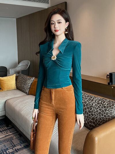 【JY.上品】 2025春新品 ショートブラウス ベーシック ベルベット スリム vネック レディース シャツ ドレス パーティー キャバ 大人 同窓会 披露宴 卒業式 結婚式 演奏会 ウェディング