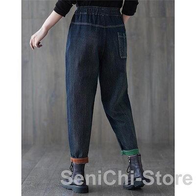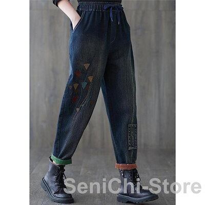サルエルパンツ デニム 刺繍 裏起毛 テーパードパンツ ボトムス ズボン レディース カジュアル ポケット付き ゆったり ウエストゴム 無地