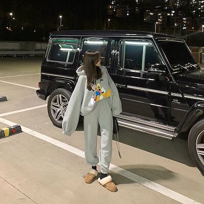大好評 【2024新品入荷激安本日限定】ミッキー スウェットシャツ スーツ レディース 冬 レイジー Bf ルーズ カジュアル スポーツ レギンス プラス ベルベット ツーピース フード付きスウェット