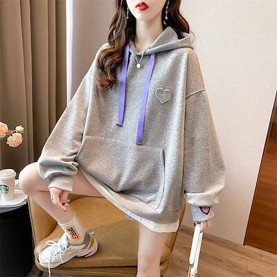 韓国 デザイン感 ハート 長袖 スウェット レディース 秋冬 ゆったり トップス フード付き