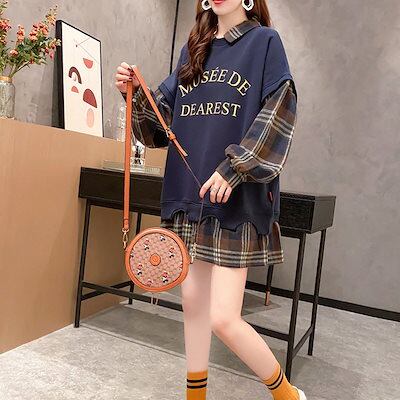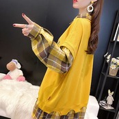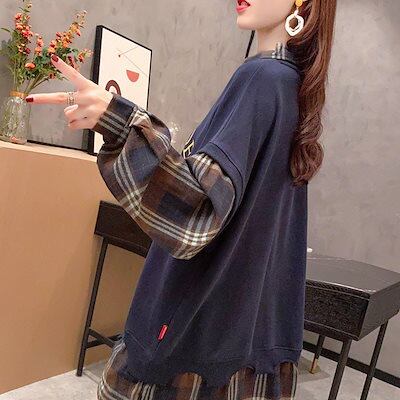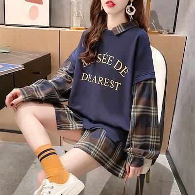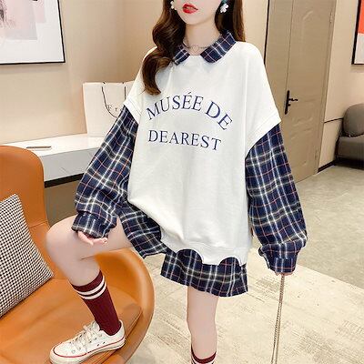 原宿系 長袖 レディース 韓国ファッション トップス トレーナー ロンT 長袖 重ね着風 原宿 ストリート グリッドパターン 春秋 カップル 男女兼用