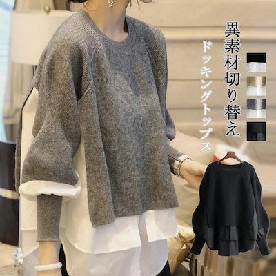 ニット レディース 秋冬 長袖 カットソー 春 ニットプルオーバー 切り替え インナー クルーネック セーター 異素材 秋 冬 トップス プルオーバー シャツ ニットセーター アウター ベーシック リ