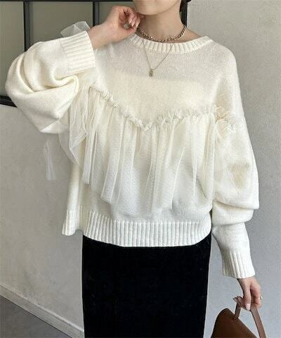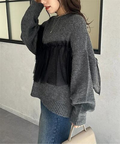 ニット トップス レディース セーター 長袖 チュール 切替 ニット ドッキング ビスチェ風 体型カバー タートルネック ニットウエア プルオーバー あったか ゆったり シンプル 大人 カジュアル