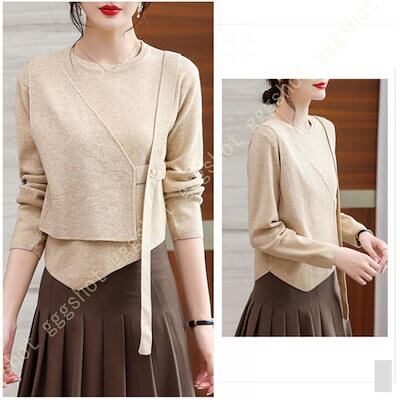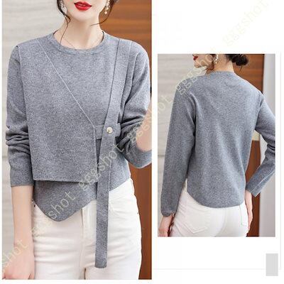 ニット セーター 長袖 トップス 秋 レディース バルーンスリーブ リブ 不規則デザイン アウター インナー おしゃれ 秋ニット 冬インナー ラウンドネック