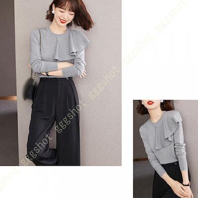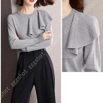 ニット セーター レディース タイト ラウンドネック アウター ニットトップス フリル スリム 大きいサイズ 可愛い リブ 保温 カットソー 暖か フェミニン
