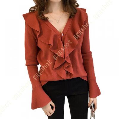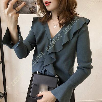 ニット セーター 長袖 Vネック トップス レディース フリル付き リブニット トップス 無地 単色 秋 アウター 冬 インナー シンプル 定番 着回し おしゃれ