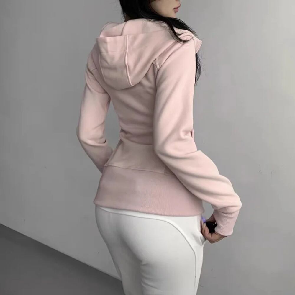 レディースカジュアルベーシックジップアップフード付きスウェットシャツ、y2kジョガー、ソリッド長袖パーカー、スリムフリーストップス、冬のファッション、2024 パーカー ジャージ y2k T240908163948_01